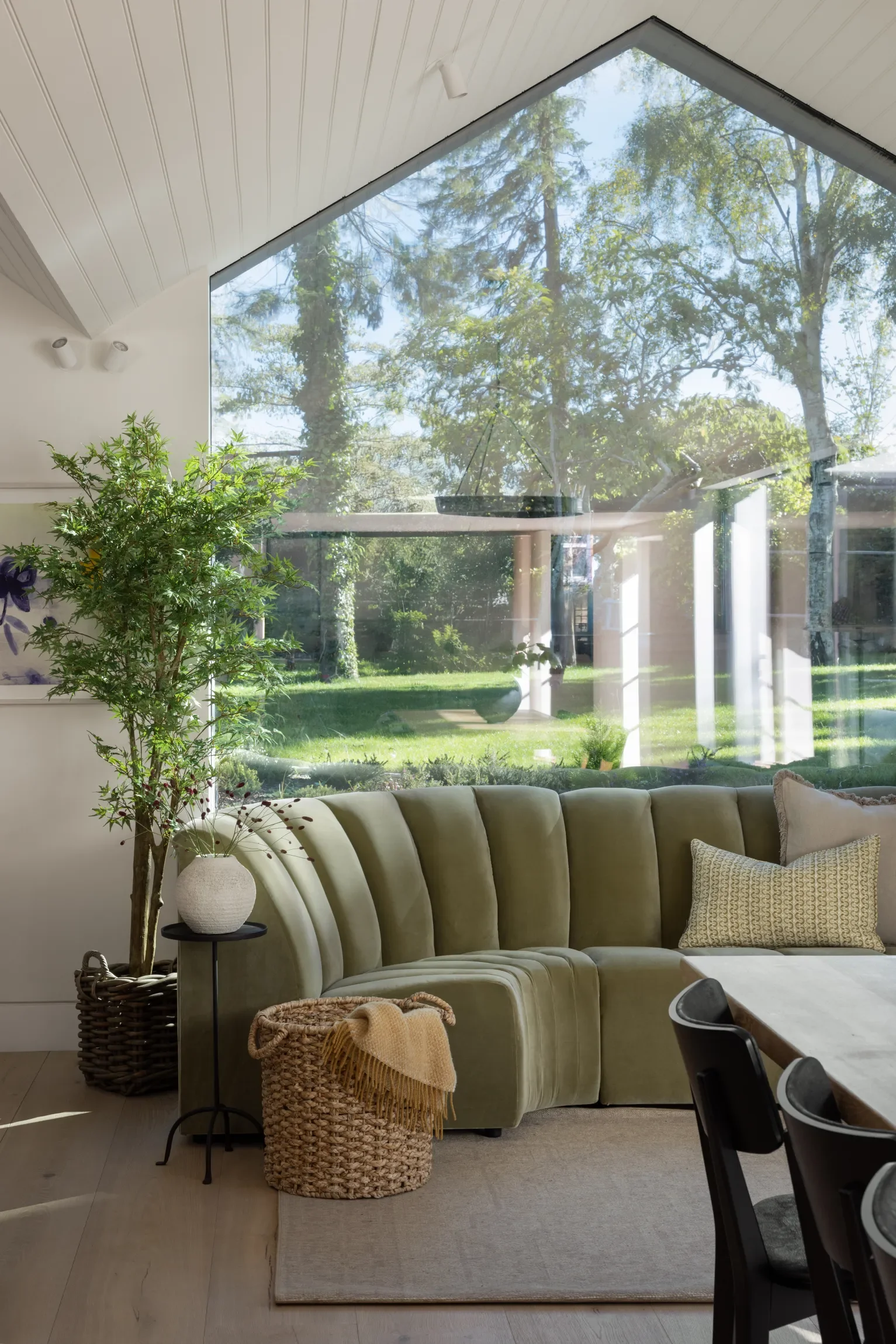 The choice of concrete and timber finishes coupled with a sage coloured sofa, indoor greenery and Kelvin Mann bird print firmly connect the indoors and outdoors, making both spaces feel like an extension of each other. “The clean lines and modern aesthetic of this room offer a nice punctuation to the original part of the house,” says Farrell.