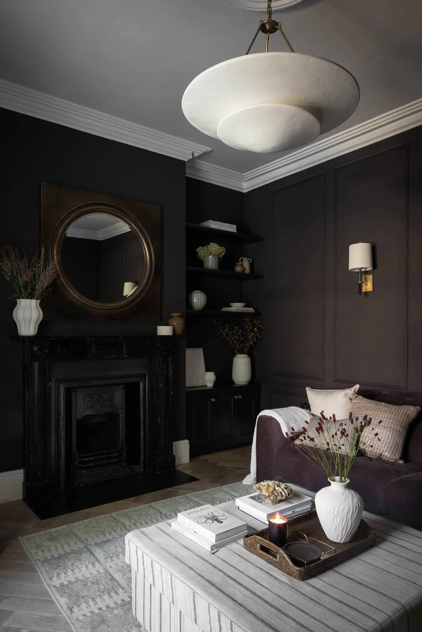 For the family snug, Farrell suggested a modern, sculptural pendant shade with a plaster white finish to punctuate the intensely dark walls, painted in Tanner’s Brown by Farrow & Ball. “This room is a total juxtaposition,” explains Farrell. “The homeowners wanted it to have a cinema feel but still to be quite rich and elegant. Our reference was a Julianne Moore house tour in Architectural Digest.” To achieve exactly the right atmosphere, Farrell created a layered lighting system with dimmers.
